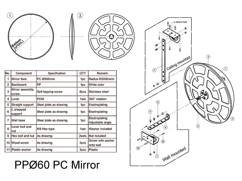 وجه المرآة: PC (بولي كربونات)، Ø600 مم، نصف القطر R2000m/m