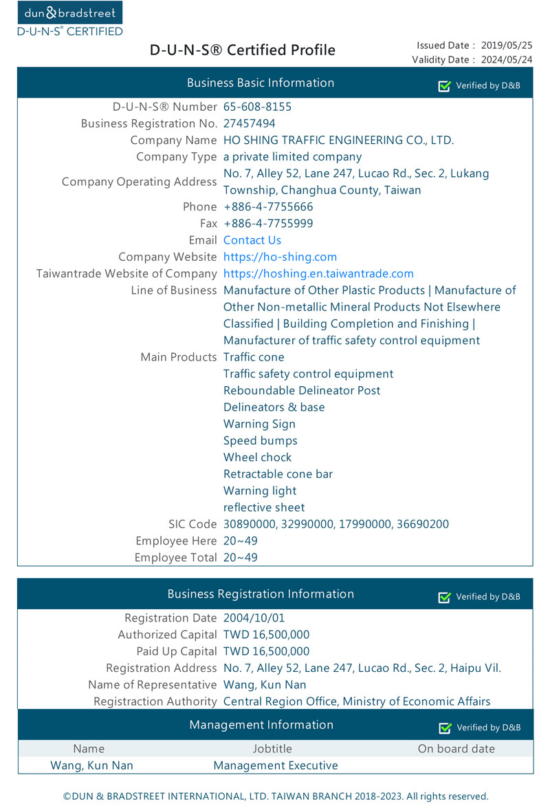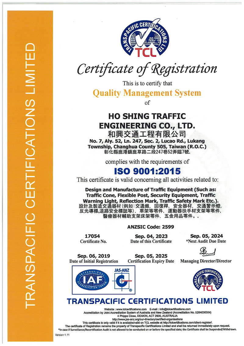 Ho Shing Traffic Engineering Co.,Ltd was established in the year of 2004 in Taiwan. We're a mold injection factory, and focus on manufacturing traffic safety devices, especially for traffic cones, delineators (bollards), and barriers. Our products can be used in the areas of roadways, constructions, work sites, plants, schools, all other outdoor and indoor areas, and other applications, which is purposed to achieve traffic safety, work zone safety, construction safety and traffic control or traffic management. As one of the leading road traffic safety cones suppliers, Ho Shing Traffic Engineering Co., Ltd. takes pride in being a reliable road cone manufacturers. Our strength Ho Shing Traffic Engineering Co., Ltd. takes pride in being a reputable road cone manufacturers and one of the foremost road traffic safety cones suppliers in the field. Our strength comes from our primary concern of people safety first. Given this philosophy, we never spare manufacturing high quality traffic cones, bollards, roadblockers and other traffic safety devices. Our products are meant to guide and alert people safety awareness either on roads or anywhere. We always put customers satisfactions ahead of other things except for sticking to the quality. Although we're not a century-year company, but we self-inspire to be the one. Customers’ order repeats are the living stream to survive year over year. We don't dare hesitating to improve services for higher customer satisfaction.