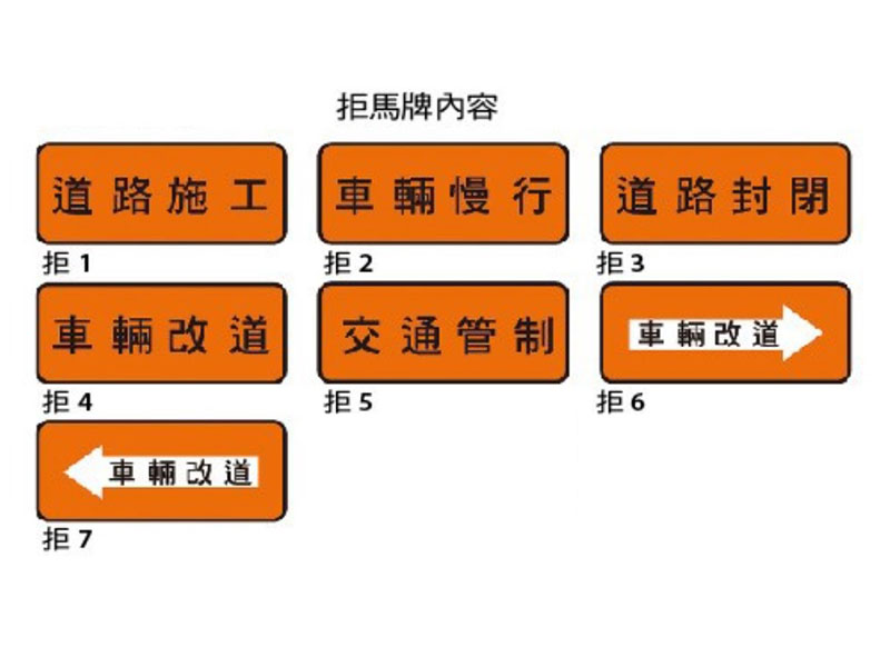 拒馬由標牌及支架組合. 通常為施工指示, 道路改向方面的名牌. 多為二排, 或三排式